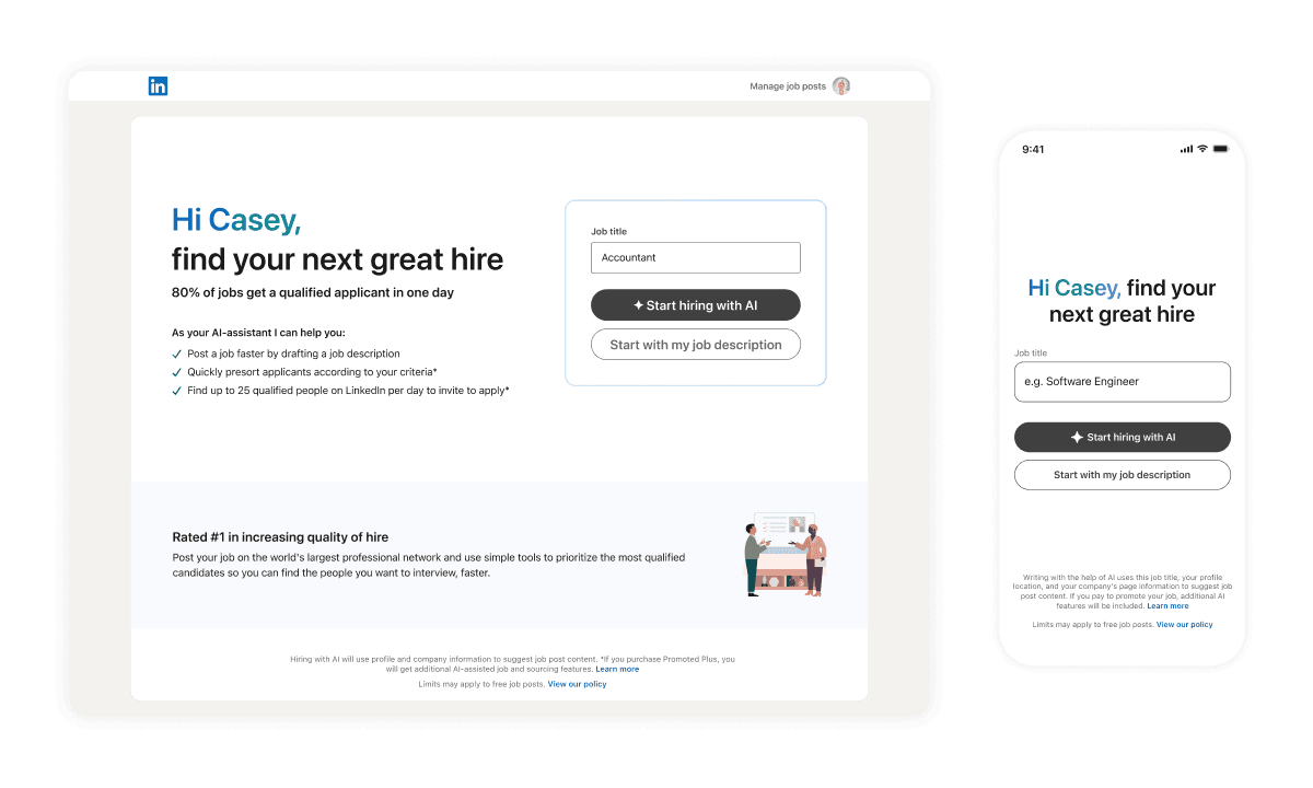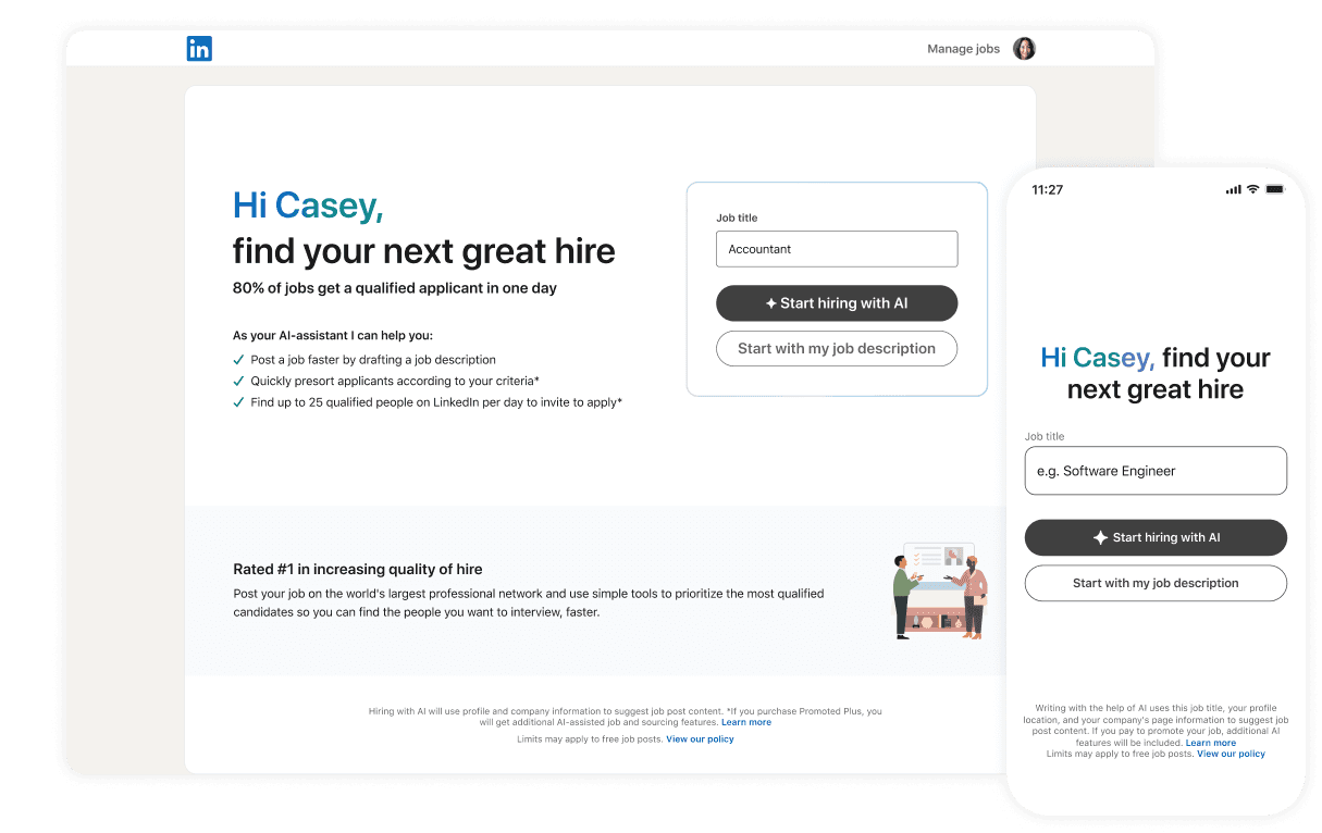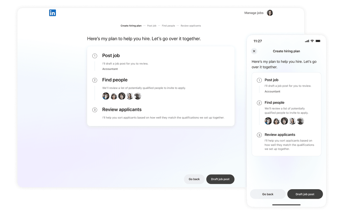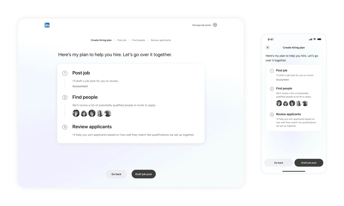 Hiring managers at LinkedIn — especially those at small and midsize businesses — were struggling with inefficient, inconsistent hiring processes. Writing job descriptions, sourcing qualified candidates, and evaluating applicants were time-consuming and intimidating for non-recruiters.