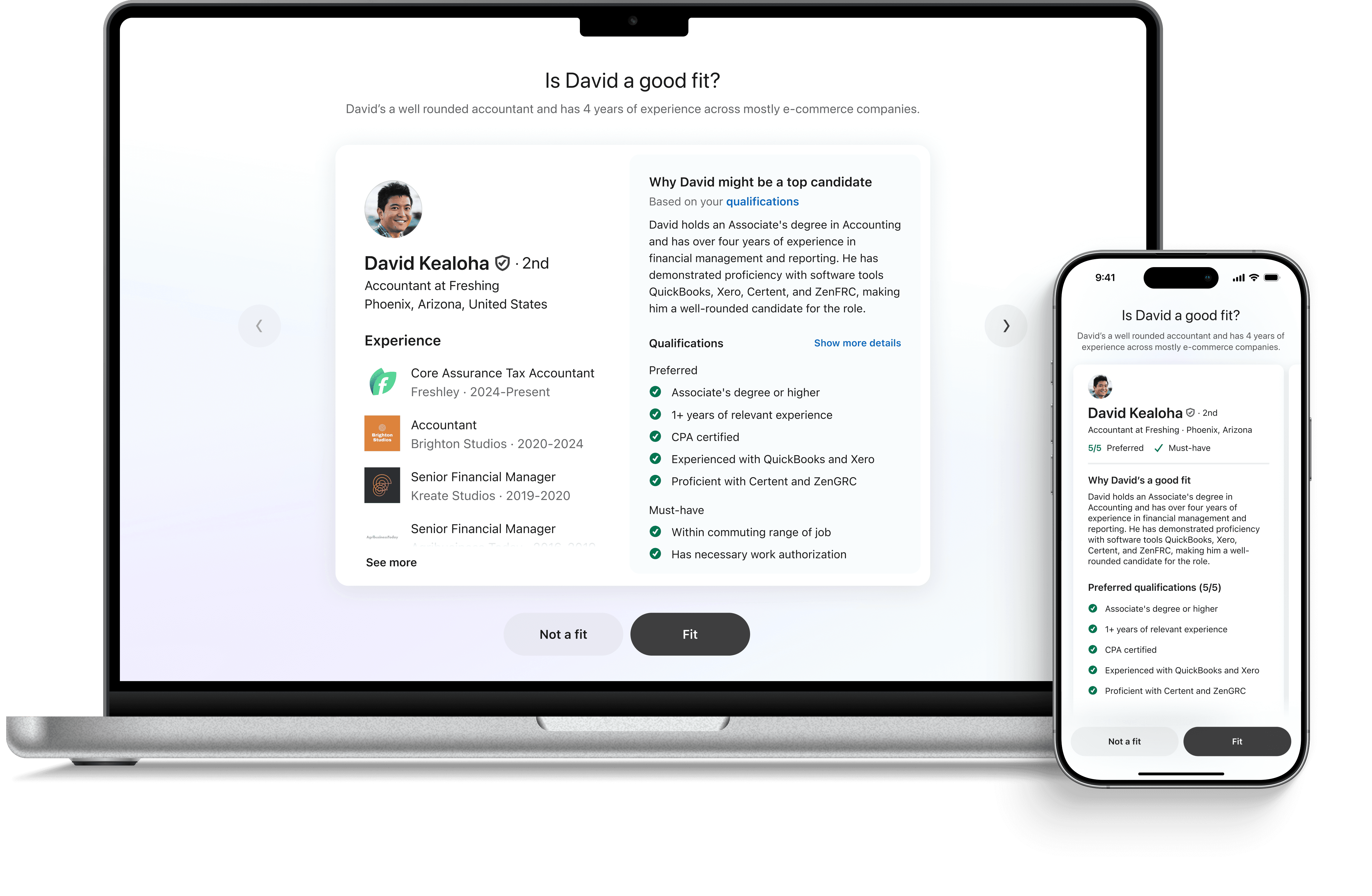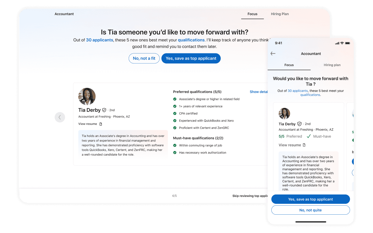 As applications come in, Hiring Assistant evaluates and sorts top matches. Managers can save or reject in one click.